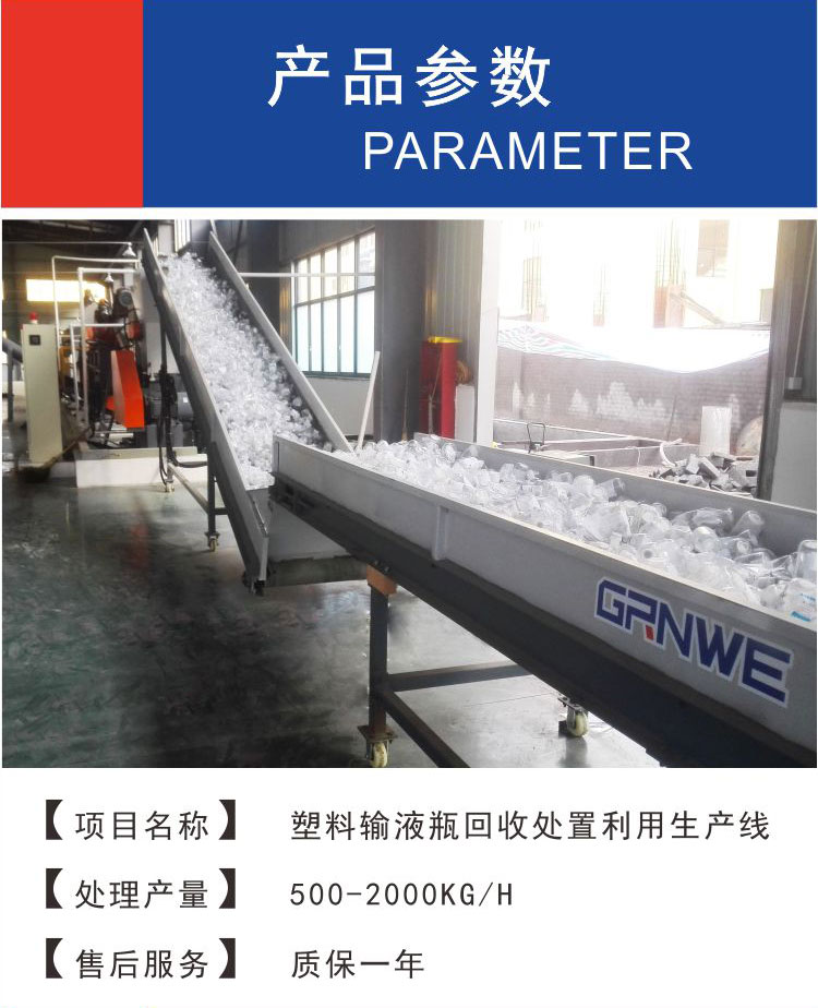 此生产线设备主要用于对医疗非违禁类废塑料的回收分类、清洗加工、塑料分离加工处理。医疗非违禁类废塑料是指:未被病人血液、体液、排泄物污染的一次性塑料器具(包含塑料输液袋、输液瓶类,但不包括输液管及注射器等)经过分选、粉碎、收集残余药剂、清洗剔除纸浆标签、分离橡胶及铝盖、分离袋(瓶)身与袋(瓶)嘴、分离丁苯橡胶等近九道工序后可生产出纯净的“医用再生聚丙烯PP”,其再生产成品可达塑料原料工业甲等二级(可用于除食、药品包装用途外其它所有工业类用途)。