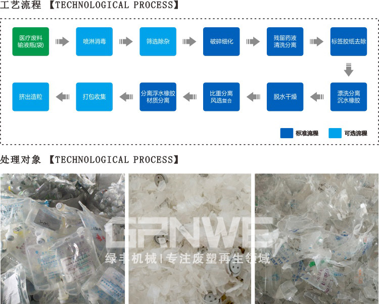 一次性塑料输液瓶(袋)回收加工生产线主要用于对未被污染的医用塑料(输液瓶/输液袋)的回收分类、清洗加工、再生造粒等的加工处理。医用非违禁类废塑料是指:未被病人血液、体液、排泄物污染的一次性塑料器具(包含塑料输液袋、输液瓶类,但不包括输液管及注射器等)经过筛选分类(瓶、袋与杂料分离)、破碎细化、残余药液清洗分离、纸浆标签去除分离、分离沉水橡胶及铝盖杂物、脱水干燥、比重分离袋(瓶)身与袋(瓶)嘴、分离发泡聚氨酯等近九道工序后可生产出纯净的“一级再生聚丙PP”(可用于除食品、药品包装、与人体直接接触用途外其它所有工业用途)、再生复合膜颗粒、聚异戊二烯橡胶及发泡聚胺脂。其全套流程采用全自动化作业,生产中间环节无需人工干预。