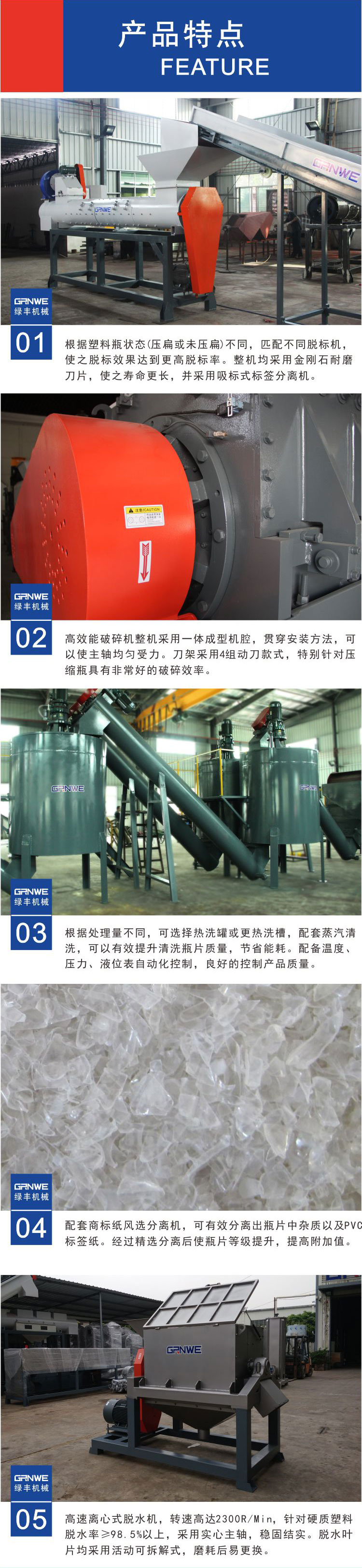 绿丰环保机械为实体生产工厂,拥有雄厚的加工生产能力,本生产线中全部设备匀由我公司自主独立生产制造。随时欢迎新老客户来我工厂实地考察指导!长丝级PET饮料瓶破碎清洗回收生产线 PET聚酯瓶回收清洗线